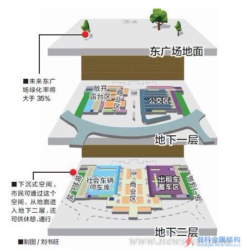 新客站東廣場效果1 石家莊新客站東廣場東西寬146米、南北長312米,總建筑面積6.7萬平方米。東廣場地下空間分為兩層,主要功能包括:公交站點、出租車蓄車、社會車輛停車、商業(yè)配套等功能,從而解決新客站的人流集散、交通換乘、商業(yè)購物等多方面需求。其中社會車輛停車位為243個;商業(yè)及步行通道面積為24510.4平方米,商業(yè)與車庫中設備用房面積約4551.8平方米;衛(wèi)生間等的面積約7710平方米。 現(xiàn)場:新客站東廣場地下二層正在進行頂板建設 近日,記者來到東廣場時,工人們正在為一個已搭建起的空間捆扎頂部鋼筋。據負責該項目的中鐵十八局石家莊項目部工程部副部長杜飛介紹,現(xiàn)在裸露在外的這個內部空間就是未來東廣場的地下二層。目前,東廣場的南北兩側都在進行地下二層的頂板建設。 杜飛說,地下二層的層高南北不同,南側略高、北側略低,這樣的設計緣于功能劃分的不同。按設計,南側地下二層主要用來停放社會車輛,北側地下二層則用來停放出租車。 東廣場地下除去公交車、私家車、出租車的停放空間,最令人期待的還有從此穿行的地鐵2號線、3號線。 根據規(guī)劃,地鐵石家莊站位于石家莊站東廣場下方,為雙線換乘站,地鐵3號線、地鐵2號線建好后,可在東廣場下方換乘。 記者走到東廣場施工中間部位,看到新客站東站房下方,一條東西走向的條狀鋼筋混凝土結構地基初見雛形,工人們正在兩側的側墻上捆扎鋼筋。據杜飛說,此時記者近距離接觸的就是正在施工的地鐵3號線。 杜飛說,由于東站房支架還沒拆除,目前還不能進行地鐵2號線施工。一旦支架拆除,2號線就馬上動工。 進度:地鐵3號線地基可見雛形 東廣場未來的交通除了有了專門的公交車、私家車以及出租車的充足地下空間外,最令人期待的還有地鐵2號線、3號線。根據規(guī)劃,地鐵石家莊站位于石家莊站東廣場下方,為雙線換乘站,在新客站東西走向的地鐵3號線和南北走向的地鐵2號線建好后,可在東廣場下方進行換乘。 近日,記者順著陡坡進入東廣場施工現(xiàn)場中間部位,看到在正對著新客站東站房的下面,一條東西走向的條狀鋼筋混凝土結構地基初見雛形,工人們正在兩側的側墻上捆扎鋼筋。記者注意到,地基并不是平坦的,6條同樣走向的凸條將其分割。“這是地鐵3號線的位置,未來將有兩條軌道。”杜飛指著地基說。 他告訴記者,由于東站房支架還沒拆除,因此目前還不能進行地鐵2號線施工。據悉,地鐵3號線在上,2號線在下。2號線位于石家莊新客站與東廣場之間,呈南北走向,為地下三層島式車站;而3號線位于石家莊站站房和東廣場地下停車場下,呈東西走向,與石家莊新客站和東廣場合建。 地鐵2號線從南北方向下穿新客站東廣場,長約200米;地鐵3號線從東西方向貫穿新客站,長約700米。旅客下火車后,不用出站就可以直接進入地鐵站,這種“零換乘”的方式方便旅客乘車,四通八達的交通網也會緩解附近的道路通行壓力。 未來:東廣場南北各建一個坡地廣場 除了在交通方面更加便利外,未來將作為主廣場的東廣場在設計中也融入了更多的休閑因素。 記者注意到,在正施工的南北兩側地下二層低于地面的外圍施工現(xiàn)場,是一片平坦的土坡,看不到繁忙的施工場面。對此,杜飛指著外圍的土坡地告訴記者,這里將建一個坡地廣場。“坡地廣場也可以說是下沉式空間,市民可以通過這個空間從地面進入地下二層。”這樣的坡地廣場在南北兩側各建一個,每個面積大約在4000平方米左右,主要是供旅客休憩、通行使用。 據了解,新火車站東西廣場景觀設計各有特色,其中,已經簡易投用的西廣場景觀特色為“水潤石門”,西廣場的設計方正而渾厚,象征了端莊大氣的石門古韻和源遠流長的歷史脈絡。而未來的東廣場景觀特色為“行云流水”,代表城市的變化、發(fā)展和未來,集合東廣場集散交通功能,蘊含八方來客匯聚于此,然后疏散至城市各處,有川流不息之意。東廣場面向主城區(qū)代表現(xiàn)代和時尚,傳達創(chuàng)新求變的時代氣息和多元包容的城市精神,將通過暢直通達的直線步行道,綠蔭繚繞的休憩廣場,波浪流轉的擋墻座椅,高低錯落的流線花街,共同營造霓光艷影的水韻廣場。 按照規(guī)劃,作為主廣場的東廣場綠地率大于35%,同時配置軌道交通、長途客運、公共交通、出租車、社會車設施,考慮市政配套、郵政電信、商業(yè)服務。 |