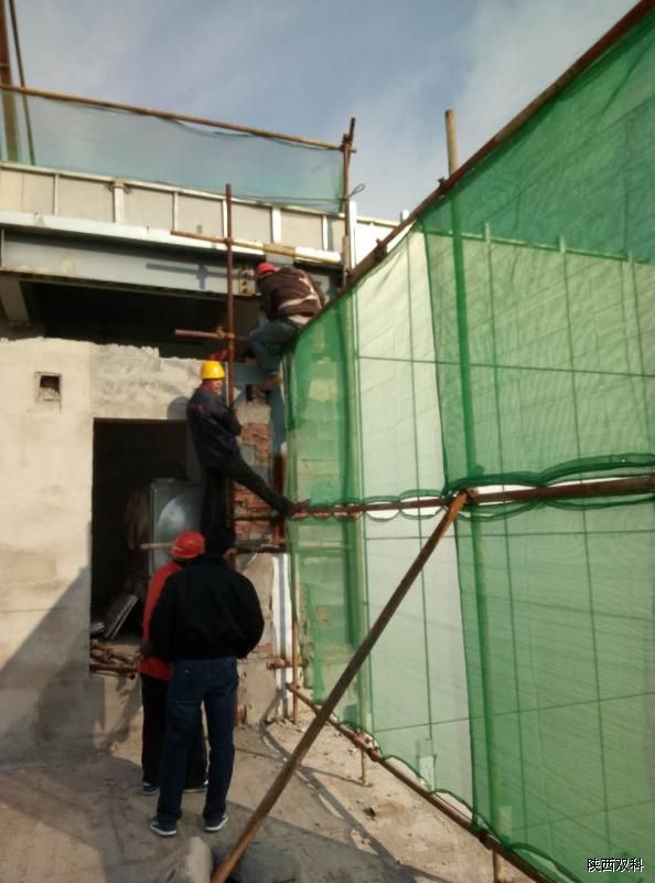 在施工階段,結構布置的位置要進行反復的核實,確保立柱做在承重構件上(采用相關的設備工具依照原結構圖紙找出軸線位置,結合鋼結構施工圖找出預埋件位置,打孔植栓安裝預埋件)施工時還應做好防雨措施,因安裝構件是需要破壞原屋面防水、安裝預埋件時打孔也會造成樓板的損傷,有效的做好防雨措施避免雨水滲漏對下層造成不必要的損失。